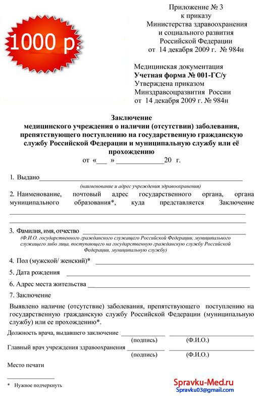 Не нужно ждать, пока кто-то более смышленый принесет документ раньше вас и займет желаемую должность. Справку Мед возьмет на себя все хлопоты по оформлению медицинской справки для госслужбы формы 001 ГСУ и гарантирует качество предоставленных документов. И сам образец справки 001 ГСУ вы можете найти также на нашем сайте.